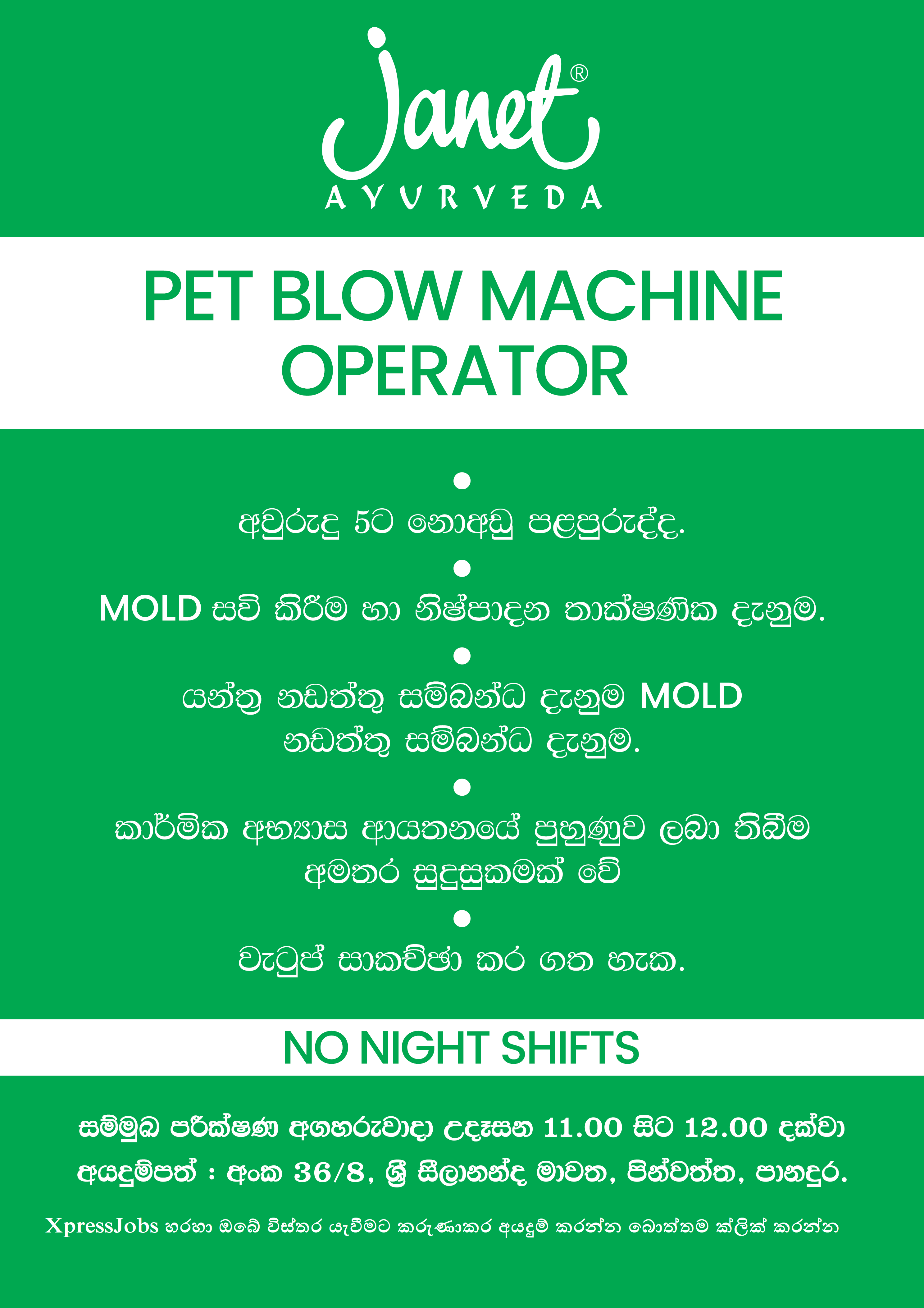 Pet Blow Machine Operator Janet Lanka Pvt Ltd Xpressjobs